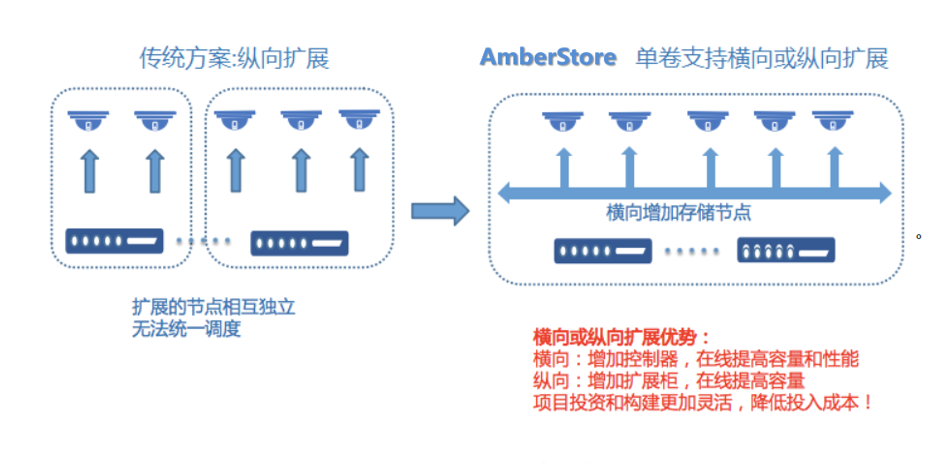 AmberStore集群存储系统支持在线扩展存储容量,而无需中断应用。用户可以通过添加存储服务器和磁盘的方式扩大系统的容量和规模,而且随着存储服务器数据的增多,整套系统的聚合带宽也会线性的增长,以满足业务不断发展所产生的容量和性能需求,从而支持更多的高清码流并发写入。AmberStore还支持通过在线更换大容量硬盘的方式进行容量扩展,依托存储系统的故障监测和数据自恢复机制,在线逐一替换小容量硬盘,达到扩容的目的。AmberStore支持在1小时内无缝的在线增加上百TB存储容量,且确保业务系统的连续性。