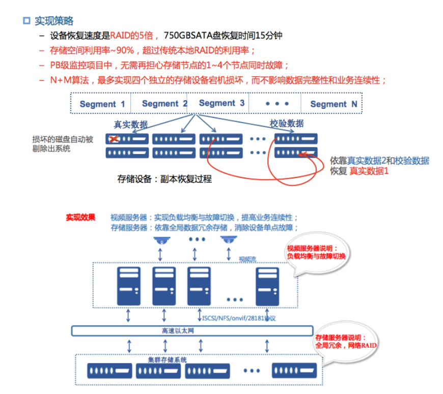 Amberstore集群存储系统采用客户端切片、多台存储服务器同时提供数据存取服务的方式满足视频监控平台的并发访问需求。由于大量的数据IO请求都被负载均衡地分散到多台存储服务器上,使得所有的存储服务器上的磁盘性能和网络带宽都可以同时得到充分的利用,存储系统的聚合带宽由多台的存储服务器上的IO带宽相加而成,从而克服了NAS的单一出口点所造成性能瓶颈,消除了传统存储系统中常见的负载不均导致的热点数据问题。Amberstore通过数据在存储服务器集群中的条带化分布实现高效、全面的负载均衡功能,充分利用硬件和网络的性能,发挥出最高IO吞吐量。满足了大量应用节点并发访问的带宽需求。